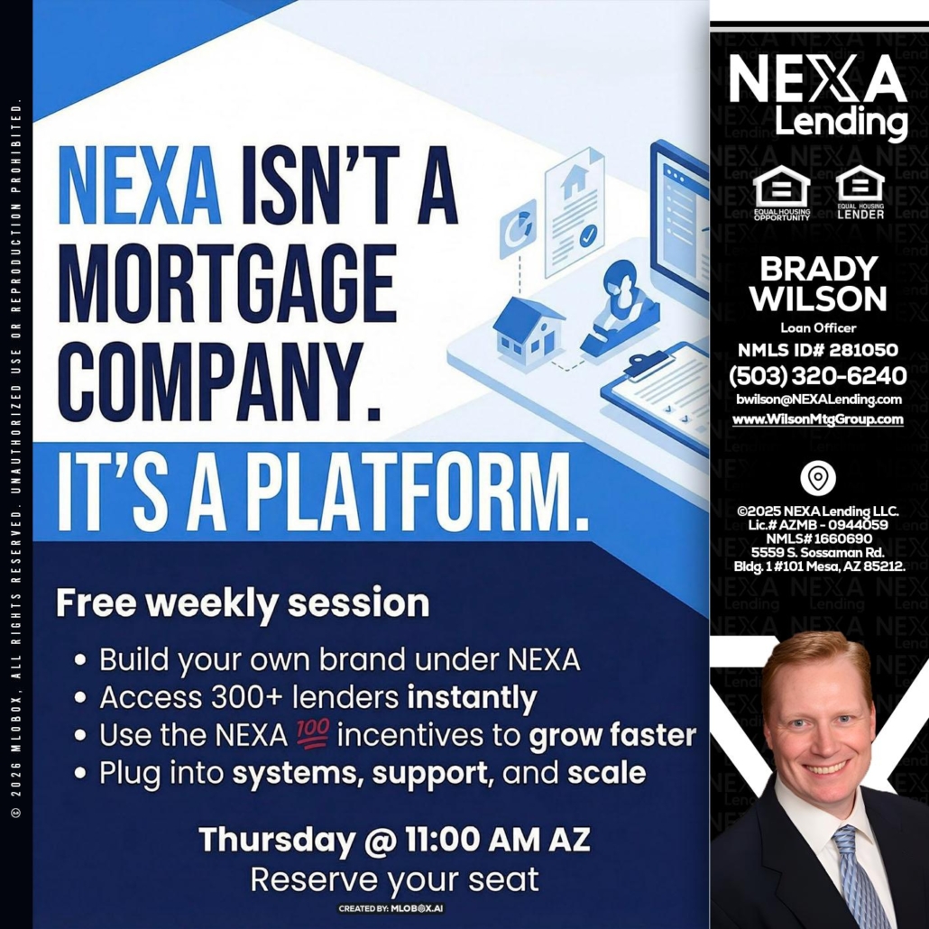 Hi, my name is Brady Wilson. I’m a Loan Officer with NEXA Lending LLC., offering personalized mortgage solutions, fast customized quotes, great rates and service with integrity.
